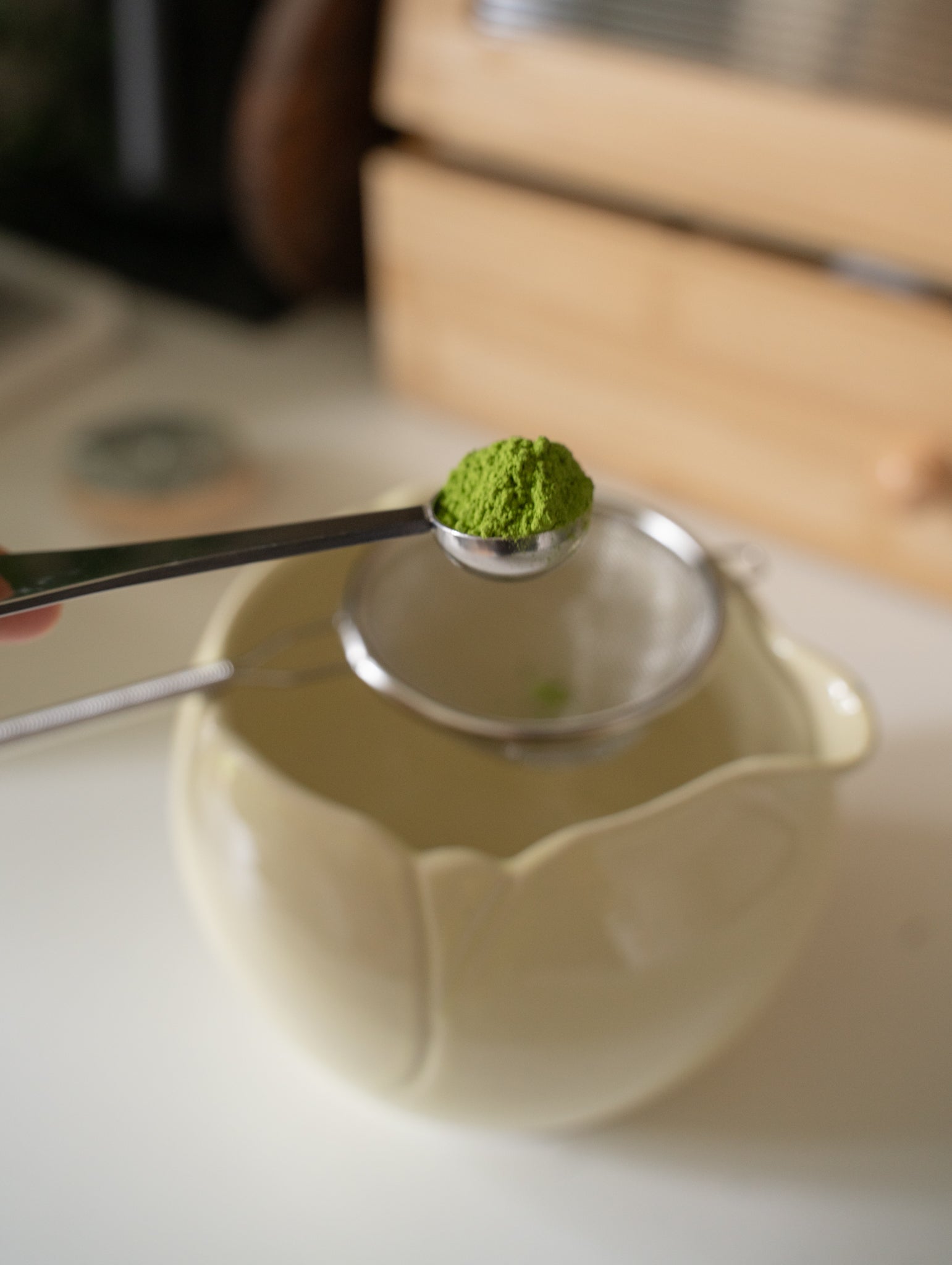 Our branded measuring spoon is made with stainless steel and measures approximately 1g of matcha per scoop. We use 3 spoonfuls (or 2 heaping spoonfuls when we're lazy) to mix the perfect 3g serving of matcha.